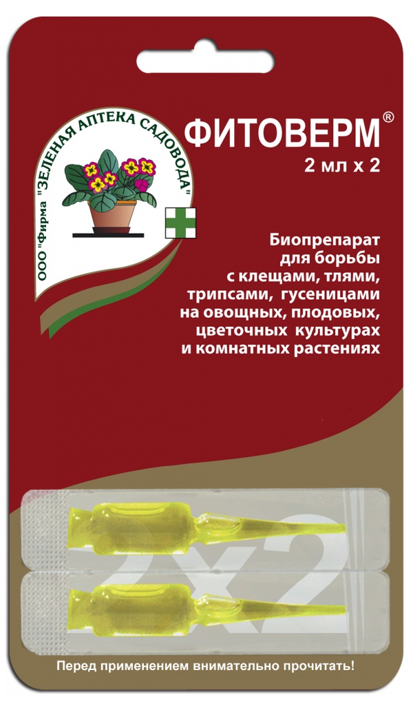 Фитоверм - биологический инсектицид. Рекомендуется для борьбы с колорадским жуком на картофеле; белянками и совками на капусте; паутинным и плодовыми клещами, листовертками, плодожоркой, пяденицами, совкой на яблонях; клещами, тлями и трип-сами на розах, Содержимое ампулы 5 мл растворяют в воде: для уничтожения трипсов в 0,5 л, для совок и тлей примерно в одном литре, для листоверток и пядениц примерно в двух литрах, для клещей и плодожорок примерно в трех литрах, а для колорадского жука примерно в пяти литрах воды. Полученным раствором опрыскивают растения при появлении вредителей. Срок защитного действия 7 дней. Срок последней обработки ? за день до сбора урожая. Средство для защиты сельскохозяйственных культур от насекомых-вредителей. НАЗНАЧЕНИЕ: Фитоверм - биопрепарат 4-го поколения, основой которого являются продукты жизнедеятельности почвенных микроорганизмов Отлично зарекомендовал себя на рынке защиты растений1 Фитоверм применяют 90% всех тепличных хозяйств России Фитоверм имеет широкий спектр действия все виды растительно-ядных клещей, колорадский жук репная и капустная белянка, капустная совка, пилильщики, листовертки, плодожорки, пяденицы, табачный и калифорнийский трипсы, а также все виды тлей Он не загрязняет окружающую среду, быстро разрушаясь в воде и почве Срок ожидания от последней обработки до сбора урожая - не более 3-х суток СПОСОБ ПРИМЕНЕНИЯ. Обработку растений проводят в период вегестации в сухую, ясную и безветренную погоду, когда выпадение осадков в первые 8-10 часов после обработки маловероятно Обработка проводится любым типом опрыскивателей, обеспечивающим мелкодисперсное распыление и равномерное смачивание листовой пластинки Уже через 6-8 часов после обработки грызущие вредители перестают питаться (для сосущих это время удлиняется до 12-16 часов) Необходимо учитывать, что гибель вредителей наступает на 2-3 сутки после обработки, а максимальный эффект достигается на 5-7 сутки Действие препарата на поверхности листа при благоприятных погодных условиях продолжается до 7 суток Даже незначительные осадки или обильная роса значительно снижают эффективность препарата Хранение рабочего раствора не допускается. При соблюдении условий применения биологическая эффективность препарата составляет 90-98% по всем перечисленным вредителям (см таблицу) Гарантийный срок хранения - 2 года со дня изготовления препарата. Класс опасности - 4. Похожие товары