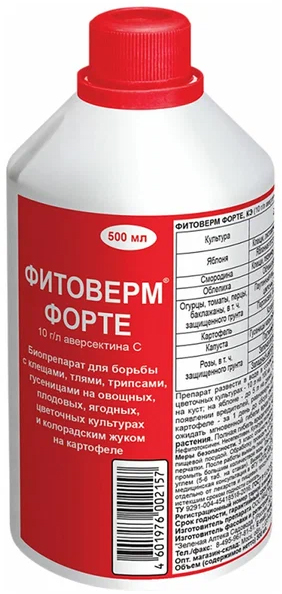 Микробиологическая защита от клещей и насекомых-вредителей Концентрат эмульсии, 10 г/л аверсектина С Изготовитель ООО НБЦ "Фармбиомед" Изготовитель фасовки "Фирма Зеленая Аптека Садовода" Зачем ФИТОВЕРМ ФОРТЕ,когда есть ФИТОВЕРМ концентрированный Фитоверм Форте удобен для больших площадей все преимущества Фитоверма сохранены: безопасен, универсален, можно применять за 1-3 дня до сбора урожая Похожие товары