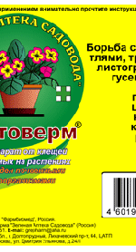 Фитоверм — биопрепарат 4-го поколения, основой которого являются продукты жизнедеятельности почвенных микроорганизмов. Фитоверм имеет широкий спектр действия: все виды растительноядных клещей, колорадский жук, репная и капустная белянка, капустная совка, пилильщики, листовертки, плодожорки, пяденицы, табачный и калифорнийский трипсы, а также все виды тлей. Он не загрязняет окружающую среду, быстро разрушаясь в воде и почве. Срок ожидания от последней обработки до сбора урожая — не более 2-х суток. Обработку растений проводят в сухую, ясную и безветренную погоду, когда выпадение осадков в первые 8-10 часов после обработки маловероятно. Обработка проводится любым типом опрыскивателей, обеспечивающим мелкодисперсное распыление и равномерное смачивание листовой пластинки. Уже через 6-8 часов после обработки грызущие вредители перестают питаться (для сосущих это время удлиняется до 12-16 часов). Необходимо учитывать, что гибель вредителей наступает на 2-3 сутки после обработки, а максимальный эффект достигается на 5-7 сутки. Действие препарата на поверхности листа при благоприятных погодных условиях продолжается от 7-20 суток. Даже незначительные осадки или обильная роса значительно снижают эффективность препарата. Похожие товары