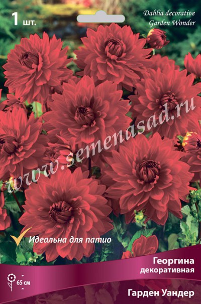 Георгина – популярное садовое растение с крупными перистыми листьями и оригинальными соцветиями-корзинками. Растения высотой 40-120 см, обильно ветвятся, формируя пышные кусты с обилием цветоносов. Корзинки немахровые и полумахровые, окраска язычковых цветков самая разнообразная, ярких и пастельных тонов, контрастная и меланжевая. Георгина декоративная - это самый представительный и многочисленный класс георгин. Полностью махровый цветок, диаметром от 10 до 25 см, имеет плоские лепестки (язычковые цветки), слегка закрученные и отогнутые к стеблю, что делает его необыкновенно пышным и эффектным. Окраска самая разнообразная. Месторасположение: солнечные, защищенные от холодных и сильных ветров места с хорошей циркуляцией воздуха. Нельзя высаживать георгины на низких и заболоченных участках. Почва: растут на любых почвах, но оптимальной для них является богатый перегноем жирный садовый суглинок или хорошо удобренная песчаная почва с кислотностью рН 6,5-6,7. Посадка начинается, когда минует опасность поздних июньских заморозков. Желательно высаживать предварительно пророщенный посадочный материал. Лунку копают на глубину 20-30 см. Клубни в посадочной яме располагают так, чтобы после заделки ямы корневая шейка была на 2-3 см ниже уровня почвы. Для высокорослых сортов сразу продумывают систему подвязки. Уход: заключается в своевременных поливах, рыхлении и окучивании. Несколько раз за сезон требуются подкормки жидкими органическими удобрениями. Растение в грунте не зимует, поэтому перед наступлением устойчивых холодов клубни выкапывают, хранят в емкостях, засыпанных торфом или песком в прохладном месте. Использование: низкорослые сорта пригодны для создания рабаток и бордюров, для украшения патио. Большинство же сортов применяется в свободных композициях и групповых посадках, в одиночной — эффектны обильноцветущие или крупноцветные. Сорта с длинными и прочными цветоносами используют на срезку. Гарден Уандер - высота растения 65 см. Куст компактный. Цветок диаметром 17 см, классической красной окраски. Цветет обильно. Идеален для патио. Похожие товары