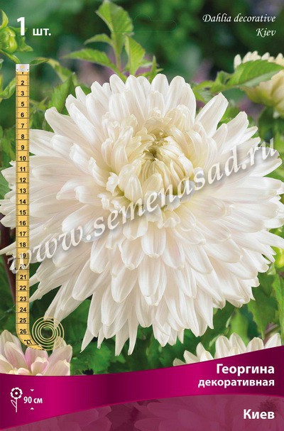 Георгина - это многолетнее с клубневидными корнями растение семейства сложноцветных. Родина дикой георгины — горные районы Мексики, Перу, Чили. Древние индейцы выращивали ее ради съедобных клубней. В Европу георгина была завезена более 400 лет назад.Высота растений колеблется от 30 до 70 см, они обильно ветвятся, имеют крупные перистые листья и соцветия-корзинки диаметром от 5 — 8 до 15 см. Корзинки немахровые и полумахровые, окраска язычковых цветков самая разнообразная, ярких и пастельных тонов. Месторасположение:солнечные, защищенные от холодных и сильных ветров места с хорошей циркуляцией воздуха. Нельзя высаживать их на низких и заболоченных участках. Расстояние при посадке зависит от высоты и формы куста того или иного сорта. Участок, выбранный для георгин, должен освещаться днем по крайней мере шесть часов. Почва: растут на любых почвах, но оптимальной для них является богатый перегноем жирный садовый суглинок, рН 6,5-6,7. Хороша для георгинов и удобренная песчаная почва. Участок, предназначенный под георгины, с осени вскапывают, а весной перекапывают. Посадка: в условиях средней полосы георгины высаживают в открытый грунт в конце первой декады июня, когда минует опасность поздних июньских заморозков. Копают лунку на штык лопаты, вбивают кол длиной 130-150 см для подвязки будущего "куста", в лунку кладут, если того требует почва, перепревший навоз, 20-30 г суперфосфата, все хорошо перемешивают, обильно поливают и сажают с комом земли клубень, предварительно подрощен-ный дома на подоконнике или в парнике. При правильной посадке корневая шейка должна быть на 2-3 см ниже уровня почвы. Растение после посадки подвязывают к колу. Потом подвязку проводят по мере нарастания вегетативной массы "куста". Дальнейший уход состоит в регулярном поливе, прополке, рыхлении, подкормках. Размножение: черенками, делением корнеклубня и очень редко прививкой. Использование: низкорослые сорта пригодны для создания рабаток, бордюров, массивов. Большинство же сортов применяется в свободных композициях и групповых посадках, в одиночной — эффектны обильноцветущие или крупноцветные. Сорта с длинными и прочными цветоносами используют на срезку. Георгина декоративная - это самый представительный, многочисленный и разнообразный класс георгин. Полностью махровый цветок, диаметром от 10 до 25 см, имеет плоские лепестки (язычковые цветки), слегка закрученные и отогнутые к стеблю, что делает его необыкновенно пышным. Средняя высота куста декоративных георгин — 90—150 см, хотя есть сорта, достигающие двух (а иногда и более) метра. Основное назначение — для групповых посадок или срезки. Киев - белый с лиловым оттенком, диаметр цветка 20см, высота растения 90 см. Похожие товары
