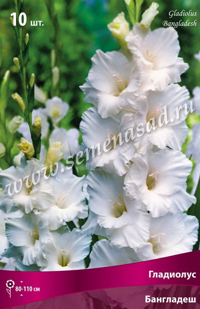 Гладиолусы - растения многолетние, клубнелуковичные. Стебли вертикальные, неветвящиеся, одиночные, облиственные 50-150см высотой. Листья линейные или мечевидные 50-80см длиной. Цветки собраны в одностороннее, двустороннее или спиральное колосовидное соцветие до 80см длиной, рыхлое, среднеплотное или плотное. Цветки сидячие с простым воронковидным околоцветникомизшести неодинаковых долей, сросшихся основаниями, различной величины и формы. Клубнелуковица округлая, возобновляется ежегодно, одета пленчатыми чешуями от белой до черно-вишневой окраски. Месторасположение: хорошо освещенные, защищенные от ветра участки. Почва: хорошо растут и цветут на любой достаточно дренированной почве со слабокислой реакцией. Посадка: мелкие клубнелуковицы высаживают через 5-10см друг от друга, крупные – через 10-15см. Глубина посадки клубнелуковиц на тяжелых почвах 8-10см, на легких – 10-13см. Цветение: июль-сентябрь. Размножение: вегетативно (клубнелуковицами и клубнепочками) и семенами. Использование: в цветниках, на клумбах, для срезки. Бангладеш - высота растения 80-110см, белый, слегка гофрированный. Похожие товары