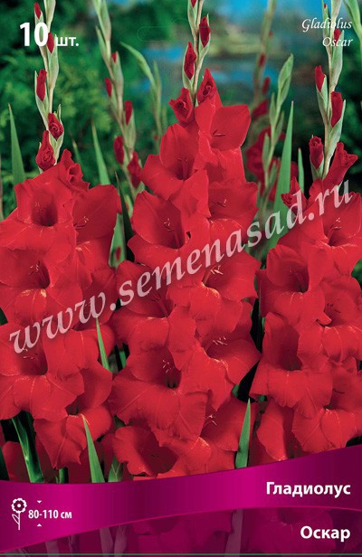 Гладиолусы - растения многолетние, клубнелуковичные. Стебли вертикальные, неветвящиеся, одиночные, облиственные 50-150см высотой. Листья линейные или мечевидные 50-80см длиной. Цветки собраны в одностороннее, двустороннее или спиральное колосовидное соцветие до 80см длиной, рыхлое, среднеплотное или плотное. Цветки сидячие с простым воронковидным околоцветникомизшести неодинаковых долей, сросшихся основаниями, различной величины и формы. Клубнелуковица округлая, возобновляется ежегодно, одета пленчатыми чешуями от белой до черно-вишневой окраски. Месторасположение: хорошо освещенные, защищенные от ветра участки. Почва: хорошо растут и цветут на любой достаточно дренированной почве со слабокислой реакцией. Посадка: мелкие клубнелуковицы высаживают через 5-10см друг от друга, крупные – через 10-15см. Глубина посадки клубнелуковиц на тяжелых почвах 8-10см, на легких – 10-13см. Цветение: июль-сентябрь. Размножение: вегетативно (клубнелуковицами и клубнепочками) и семенами. Использование: в цветниках, на клумбах, для срезки. Оскар - высота растения 80-110см, насыщенно-красный, бархатистый. Похожие товары