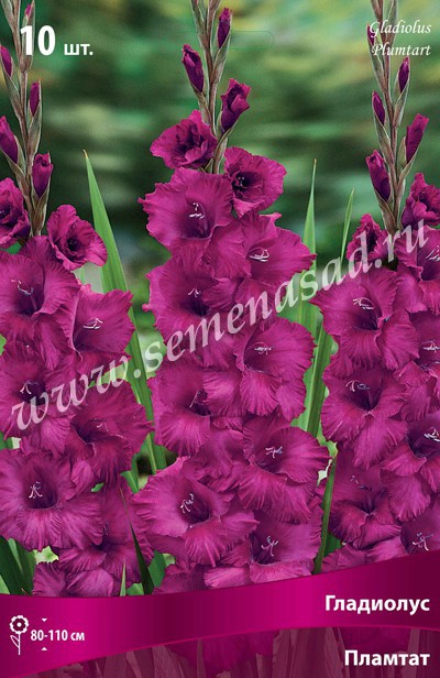 Гладиолусы - растения многолетние, клубнелуковичные. Стебли вертикальные, неветвящиеся, одиночные, облиственные 50-150см высотой. Листья линейные или мечевидные 50-80см длиной. Цветки собраны в одностороннее, двустороннее или спиральное колосовидное соцветие до 80см длиной, рыхлое, среднеплотное или плотное. Цветки сидячие с простым воронковидным околоцветникомизшести неодинаковых долей, сросшихся основаниями, различной величины и формы. Клубнелуковица округлая, возобновляется ежегодно, одета пленчатыми чешуями от белой до черно-вишневой окраски. Месторасположение: хорошо освещенные, защищенные от ветра участки. Почва: хорошо растут и цветут на любой достаточно дренированной почве со слабокислой реакцией. Посадка: мелкие клубнелуковицы высаживают через 5-10см друг от друга, крупные – через 10-15см. Глубина посадки клубнелуковиц на тяжелых почвах 8-10см, на легких – 10-13см. Цветение: июль-сентябрь. Размножение: вегетативно (клубнелуковицами и клубнепочками) и семенами. Использование: в цветниках, на клумбах, для срезки. Пламтат - высота растения 80-110см, пурпурно-фиолетовый,бархатистый,концы лепестков сложены в складку. Похожие товары