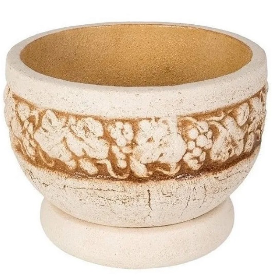 Цветочный горшок изготовлен из шамотной глины высокотемпературного обжига. Изнутри покрыт специальной кварцевой глазурью. Выполнен в бежевом цвете с коричневым цветом в области декора. Декорирован узорами из виноградной лозы в виде ободкообразной ленты. Горшок по форме напоминает приземистую восточную пиалу. Похожие товары