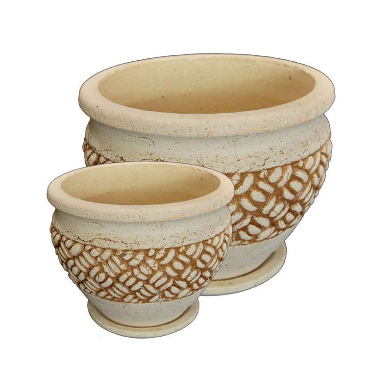 48см, Объём: 35л Цветочный горшок изготовлен из шамотной глины высокотемпературного обжига. Изнутри покрыт специальной кварцевой глазурью. Выполнен в бежевом цвете, по линии узора выделен коричневым цветом. Декорирован узорами из линий, имитирующими лёгкие трещинки под старину и широкой лентой с узором вокруг горшка, имитирующем плетение. Горшок по форме напоминает сжатый горшок с небольшим ободком по верхнему краю. Похожие товары