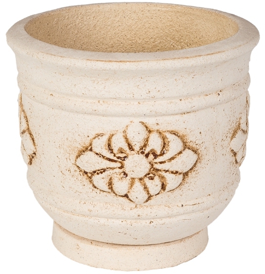 16см, Объём: 2л Цветочный горшок изготовлен из шамотной глины высокотемпературного обжига. Изнутри покрыт специальной кварцевой глазурью. Выполнен в бежевом цвете. Декорирован узорами из линий, имитирующими лёгкие трещинки под старину и цветочным узором в центральной части. Горшок по форме напоминает небольшой классический горшок с круглым основанием и ободком по верхнему краю. Похожие товары