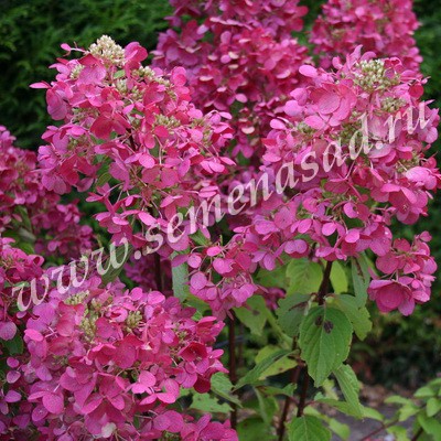 Гортензия метельчатая - кустарник высотой до 2 м. Крона широко раскидистая. Листва темно-зеленая. Цветки собраны в соцветия-метёлки длиной до 30 см, сначала белые, а со временем розовеют, образуются на побегах текущего года. Для обильного цветения рекомендуется проводить ежегодную весеннюю обрезку до начала вегетации. Светолюбива, но может расти и в полутени. Нуждается во влажной и плодородной почве. Лучше растет на кислых почвах. Зимостойка (до -25С). Даймонд Руж - куст высотой до 200 см. Цветки при распускании белые, затем розовеют, к августу приобретают красный цвет, который вскоре становится красно-фиолетовым. Соцветия крупные (30-40 см). Местоположение: солнце, полутень. Почва: предпочитает плодородные, рыхлые, кислые почвы. Не переносит извести. Использование: одиночные и групповые посадки. Похожие товары