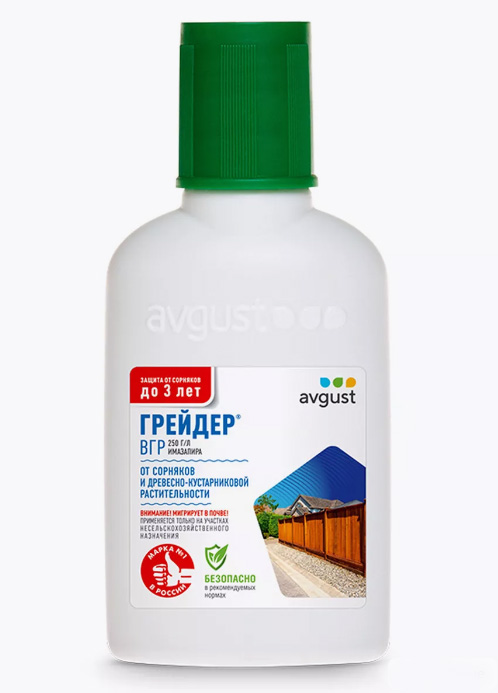 Грейдер - системный гербицид сплошного действия для уничтожения всех видов нежелательной травянистой и древесной растительности. Применяется на землях несельскохозяйственного назначения. Препараты от сорной растительности обладают ограниченным сроком действия. Такие свойства вполне оправданы и необходимы для того, чтобы после очистки территорий была возможность что-то на них посадить. Но бывают ситуации, когда нужно освободить участок под постройку дома или, например, избавиться от сорняков на погосте на длительное время. Здесь на помощь и приходит Грейдер. Он уничтожает все виды нежелательной травянистой и древесно-кустарниковой растительности, ему подвластны даже злостные и карантинные сорняки, в том числе амброзия полыннолистная. Грейдер - и ничего не растёт! Также Грейдер легко справляется с лиственной и хвойной порослью, например, осиной, березой, ольхой, ивой, сосной, елью и др. Препарат обладает высокой почвенной активностью и уничтожает не только существующие сорняки, но и новые всходы на срок до 3-х лет (в зависимости от нормы расхода, количества сорняков, типа почвы и др.). Уже через час после обработки гербицид не смывается дождем, результативен при широком диапазоне температур. Несмотря на то, что Грейдер малотоксичен для млекопитающих, птиц и пчел, подходить к его применению нужно со всей ответственностью, дабы не уничтожить полезные культуры. Не проводите обработку ближе нескольких метров к таким растениям, препарат имеет умеренную миграцию в почве, поэтому способен негативно повлиять на их развитие. При использовании препарата важно четко следовать инструкции и не превышать допустимых норм. В течение первых суток после обработки прекращается рост и развитие растений. Видимые признаки повреждений проявляются через 7-14 дней в виде обесцвечивания и побурения точек роста. Полная гибель травянистой растительности наступает через 1-2 месяца, древесно-кустарниковой – через 2-3 месяца. Похожие товары
