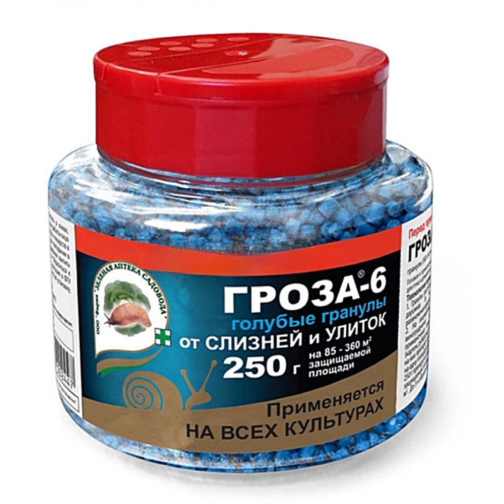 Готовые к применению гранулы для борьбы с улитками и слизнями. Кроме активного вещества против слизней (метальдегида) препарат содержит добавки, привлекающие вредителей и отпугивающие птиц. Слизни и улитки с большой охотой идут на гранулы Грозы, а после контакта с ними теряют слизь и гибнут. Удобнее всего гранулы Грозы рассыпать в междурядьях, таким образом, создать защитный барьер от слизней. При таком способе применения упаковки хватает на большую площадь. Похожие товары