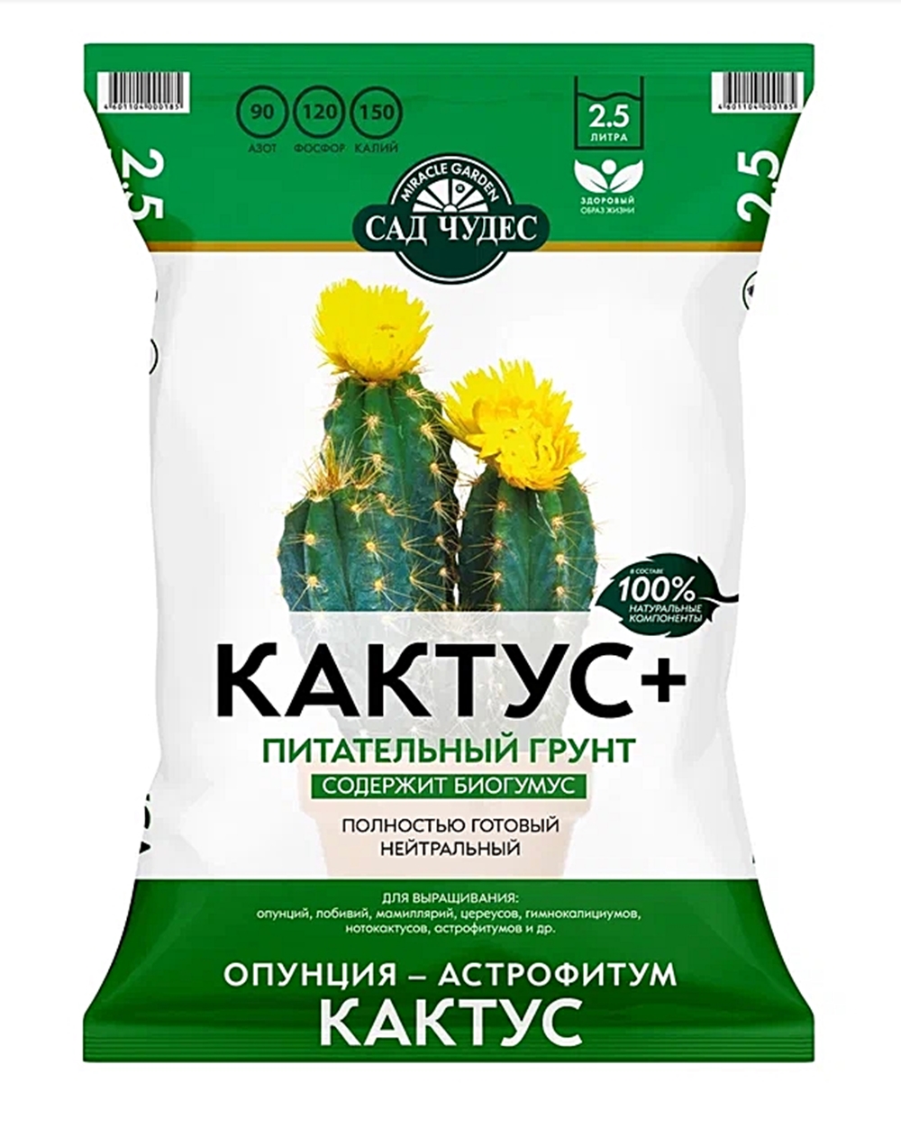 Почвогрунт полностью готовый нейтральный, повышенной плотности. В его состав входит мраморный отсев для повышения содержания кальция, мелкий керамзит и песок для повышения плотности грунта. Характеризуется пониженным содержанием элементов питания. Особенно эффективен для выращивания кактусов: опунций, лобивий, мамиллярий, цереусов, гимнокалициумов, нотокактусов, астрофитумов и другие. Технология применения:При посадке (пересадке) цветочно-декоративных горшечных растений рекомендовано на дно горшка положить дренаж (слоем на 1/4-1/5 высоты горшка), насыпать грунт, слегка уплотнить, посадить растения, досыпать грунт, оставив свободным пространство для полива, не менее 1,5-2 см от верхнего края горшка и обильно полить.Первые 7-10 дней рекомендовано защищать растения от прямых солнечных лучей и почаще опрыскивать. Дальнейший уход общепринятый. Подкармливать растения можно начинать не ранее, чем через 1,5-2 месяца.Для препятствования закислению грунта, исключая появление на поверхности грунта плесени и мхов рекомендуется сверху насыпать 1-2 сантиметра керамзитового дренажа. Внимание! Не рекомендуется в качестве добавок использовать продукцию других производителей во избежание нарушения режима питания растений. Происхождение:Торфогрунт изготовлен из смеси высококачественных верховых торфов различной степени разложения с добавлением природных структурирующих компонентов (очищенного речного песка), биогумуса и комплексного минерального удобрения.В грунт добавлен песок для улучшения структуры почвы. Биогумус служит естественным стимулятором роста растений. Комплексное минеральное удобрение содержит необходимый состав макро- и микроэлементов в доступной для растений форме. В его состав входит мраморный отсев для повышения содержания кальция, мелкий керамзит и песок для повышения плотности грунта. Эффективность:-Повышает всхожесть семян и приживаемость растений;-Улучшает их декоративные качества. Содержание основных питательных элементов, мг/л, не менее:Азот (NH4 + NO3) 90Фосфор (P2O5) 120Калий (K2O) 150pH солевой суспензии 6,0-6,5Гарантийный срок хранения: 24 месяцаСрок годности: 3 годаТемпература хранения: от -35С до +40СОбъем упаковки: 2,5л Похожие товары