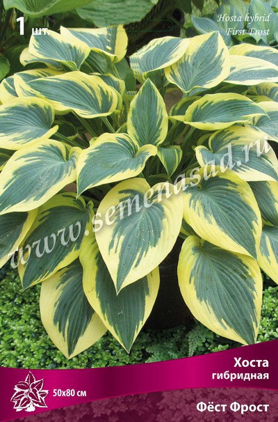 Хосты - многолетние растения с компактным или коротковетвистым корневищем. Листья прикорневые, на черешках, сравнительно крупные, разной окраски и формы: зеленые, голубовато-сизые, пестрые, от узколанцетных до широкояйцевидных. Цветоносы почти не облиственные, крупные, у некоторых видов до 120см высотой. Цветки воронковидные или воронковидно-колокольчатые, сиреневые, фиолетовые, реже белые, собраны в кистевидное, часто однобокое соцветие. Месторасположение: теневыносливы, но есть гибриды, способные расти под лучами солнца. На одном месте могут расти более 20 лет. Почва: предпочитают слегка кислые, влажные почвы. Размножение: делением куста. Кусты делят весной, до начала развертывания листьев. Разрастается медленно. Использование: эффектны в одиночных посадках на фоне газона, особенно пестролистные формы. Подходит для бордюров, рабаток, смешанных групп. Красивы около водоемов. Фёст Фрост - высота куста 50см, ширина 80см, листья голубовато-зеленые с желтовато-белой каймой. Похожие товары