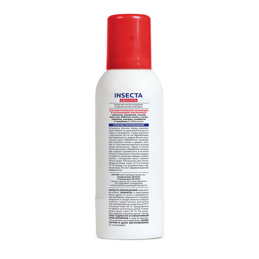 Преимущества: Удобная форма в виде аэрозоля. Обладает мгновенным действием. Не оставляет пятен на коврах и мебели. Действует на широкий спектр вредителей, таких как тараканы, муравьи, блохи, клопы, мухи, бабочки моли, сверчки, мокрицы, уховертки, чешуйницы. Срок годности: 3 года Меры безопасности при использовании препарата Обработку помещений проводят при открытых форточках (окнах). Через 15 минут после обработки проветрить помещение в течение 30 минут, после чего поверхности, с которыми может соприкоснуться человек, промыть мыльно-содовым раствором. Хранить препарат отдельно от лекарств, пищевых продуктов и кормов для животных в сухом, прохладном месте, недоступном для детей и животных. Похожие товары