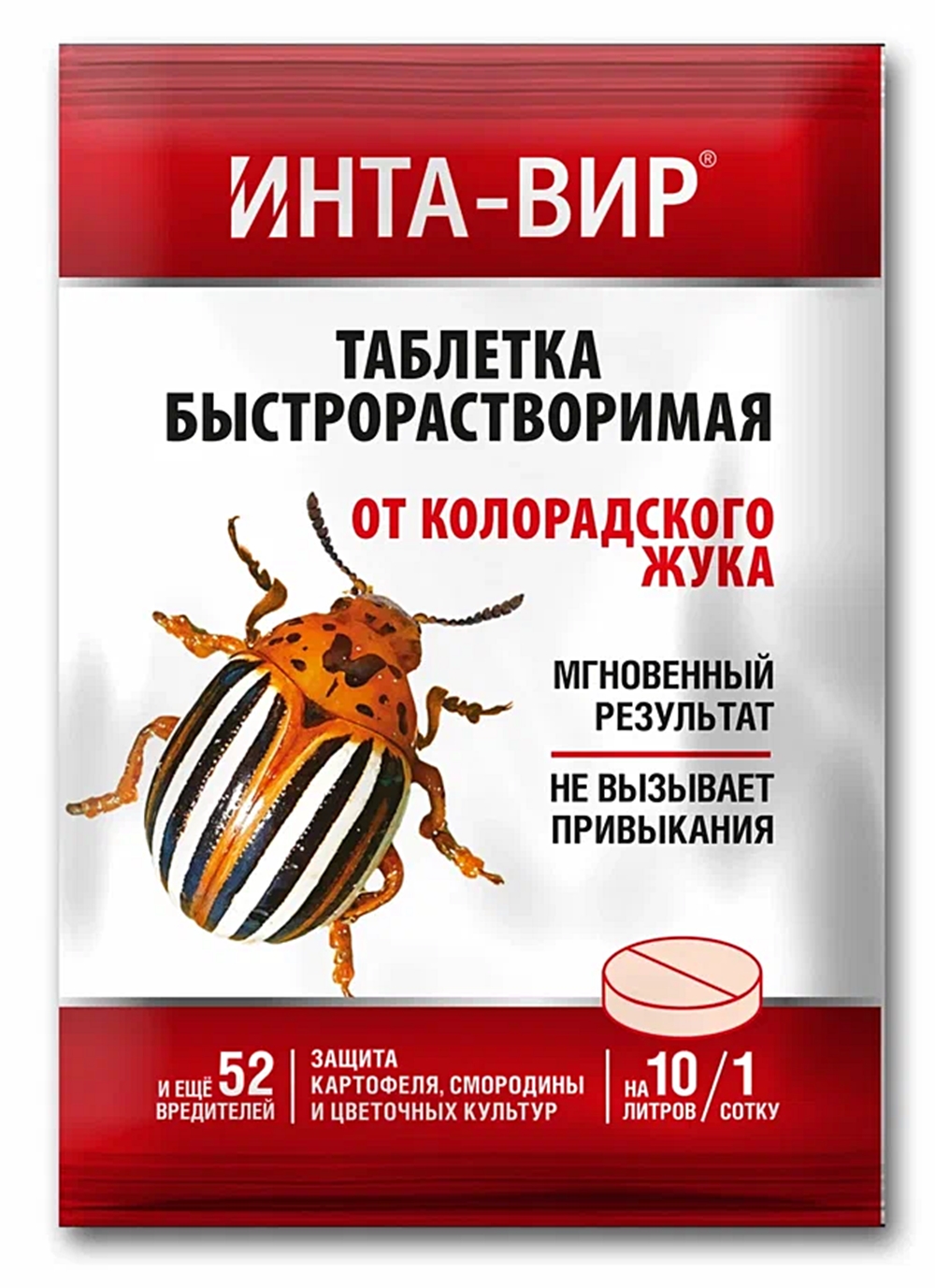 Инта-Вир «Инсектицидная водорастворимая таблетка»Препарат для уничтожения насекомых вредителей в садах, огородах, теплицах. Применяется: -Для уничтожения вредителей в период вегетации и интенсивного плодоношения-Для всех видов овощных, плодовых, ягодных культур-Для декоративных и цветочных культур Преимущества: -От 52 видов вредителей-Растворимая в воде таблетка -Уникальная технология производства -Безопасно для людей и домашних животных -Эффективность доказана тестами Похожие товары