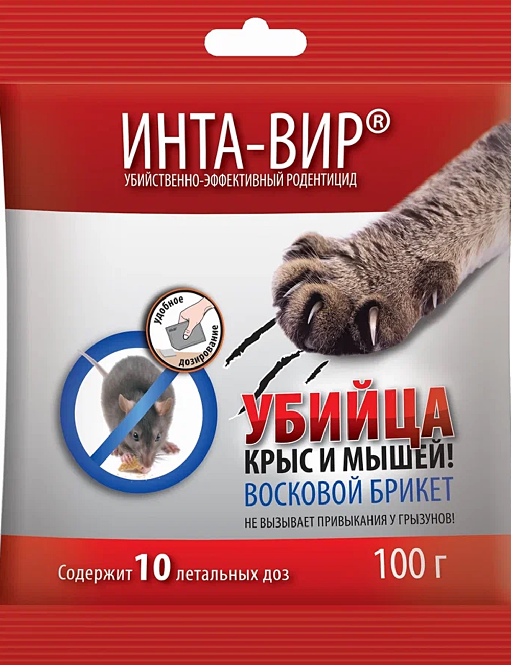 Инта-вир восковой брикет 100гПриманка полностью говая к использованию. Применяется для избавления от различных грызунов (крыс, мышей, полевок ит.д.). Действие препарата основано на мумифицирующем действии в отношении грызунов. После поедания и смерти животное превращается в мумию, которая не выделяет неприятного запаха, так как не происходит разложения. Применение препарата заключается в раскладывании и пакетиков с приманкой в местах обитания грызунов. Удобная упаковка (10 смертельных доз по 10 гр.), позволяет массово уничтожить грызунов на участке или в помещении. Препарат абсолютно безопасен для людей и домашних животных.Бренд: Инта вир Срок годности: 2 года Сегмент: Дом Характер использования: Родентициды (средства от грызунов) Состав: Бродифакум - 0,005%; битрекс, краситель, пищевые аттрактанты до 100%. Похожие товары