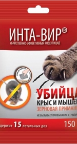 Инта-вир зерновая приманка 150гПриманка полностью говая к использованию. Применяется для избавления от различных грызунов (крыс, мышей, полевок ит.д.). Действие препарата основано на мумифицировании грызунов. После поедания и смерти животное превращается в сухой труп, которые не выделяет неприятного запаха, так как не происходит разложения. Применение препарата заключается в раскладывании и пакетиков с приманкой в местах обитания грызунов. Удобная упаковка (15 смертельных доз по 10 гр.), позволяет массово уничтожить грызунов на участке или в помещении. Препарат абсолютно безопасен для людей и домашних животных.Бренд: Инта вир Срок годности: 2 года Сегмент: Дом Характер использования: Родентициды (средства от грызунов) Состав: Бромадиолон - 0,005%; битрекс, краситель, пищевая основа. Похожие товары