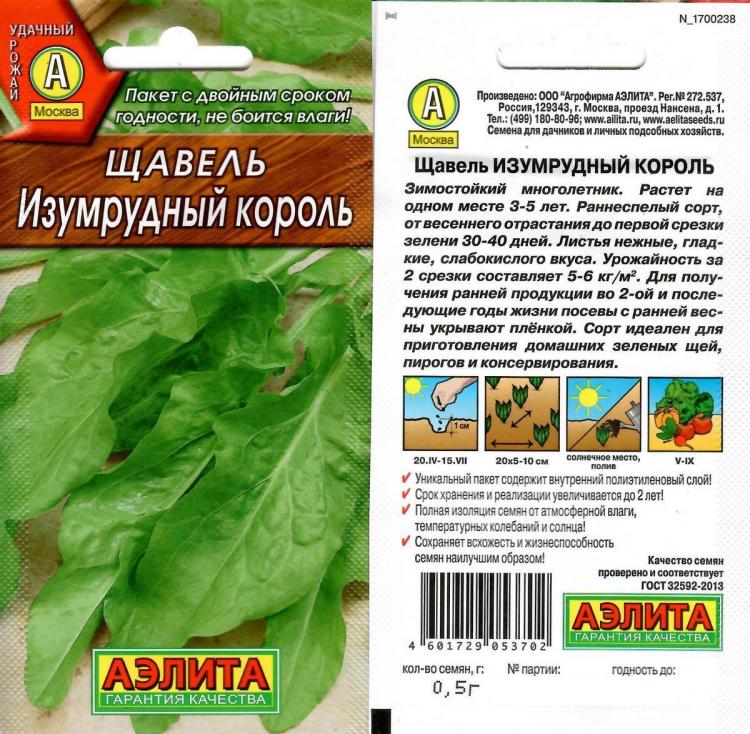 Зимостойкий морозоустойчивый многолетник. Раннеспелый сорт, период от всходов до первой срезки листьев 30-40 дней. Листья нежные, овально-удлиненной формы, светло-зеленые, гладкие, с приятным слабо-кислым вкусом. Высокопродуктивный, урожайность за 2 срезки составляет 5-10 кг/м2. Для получения ранней продукции во 2-ой и последующие годы жизни посевы с ранней весны укрывают плёнкой. Сорт идеален для приготовления домашних зеленых щей и консервирования. Посев семян в открытый грунт на глубину 1-1,5 см. Всходы прореживают. Первую срезку зелени проводят через 2-2,5 месяца после посева. Цветочные стрелки регулярно удаляют. Последнюю массовую срезку проводят не позже середины августа для успешной перезимовки растений. Растениям необходимы регулярные поливы, прополки, рыхления, подкормки. Похожие товары