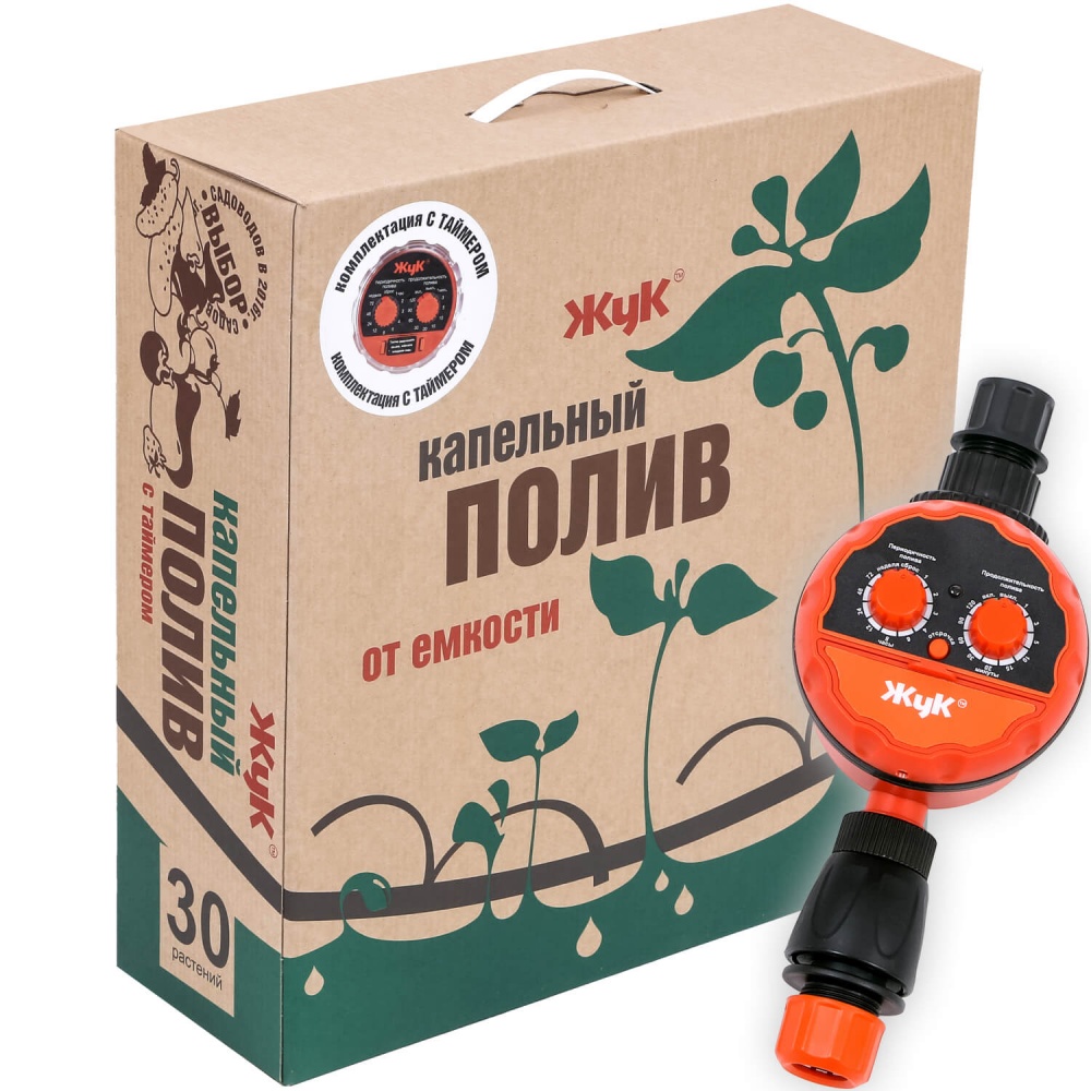 Прикорневой капельный полив Жук от ёмкости с таймером полностью готов к работе. Используется в парниках и теплицах, а также на открытом грунте. Имеет электронный таймер, с помощью которого можно настраивать продолжительность и интервалы между поливами. Комплектация: - электронный таймер - 1 шт., - шланг магистральный 9 м., - шланг подающий 40см - 30 шт., - капельницы - 30 шт., - штуцер присоединения к ёмкости - 1 шт., - трубка уровень прозрачная 1 м. - 1 шт., - подвес для трубки уровня -1 шт., - тройник малый - 15 шт., - кран - 1 шт., - уголок для магистрального шланга - 2 шт., - тройник большой - 2 шт., - заглушка для магистрального шланга - 2 шт., - прижим для магистрального шланга -18 шт., - шило для магистрального шланга - 1 шт., - штуцер 1/2" ( для соединения с ёмкостью) - 1 шт., - штуцер 3/4(для монтажа фильтра) - 2 шт., - фильтр тонкой очистки - 1 шт., - инструкция по монтажу. Система «теплого» полива от емкости обеспечит идеальный уход за растениями, выращиваемыми как в открытом грунте, так и в теплицах (огурцами, томатами, перцами, баклажанами и т.п.). Вода, подаваемая от емкости, может быть не только прогрета до оптимальной температуры, но и обогащена по вашему желанию необходимыми удобрениями. А система разведения капельниц на гибких шлангах обеспечивает профессиональный полив прикорневой зоны. Выбирая автоматизированную систему полива с таймером, вы обеспечите бесперебойный полив растений на участке даже в ваше отсутствие. Такая система позволяет настроить периодичность и продолжительность подачи воды, что облегчит уход за огородом и высвободит время для отдыха. Похожие товары