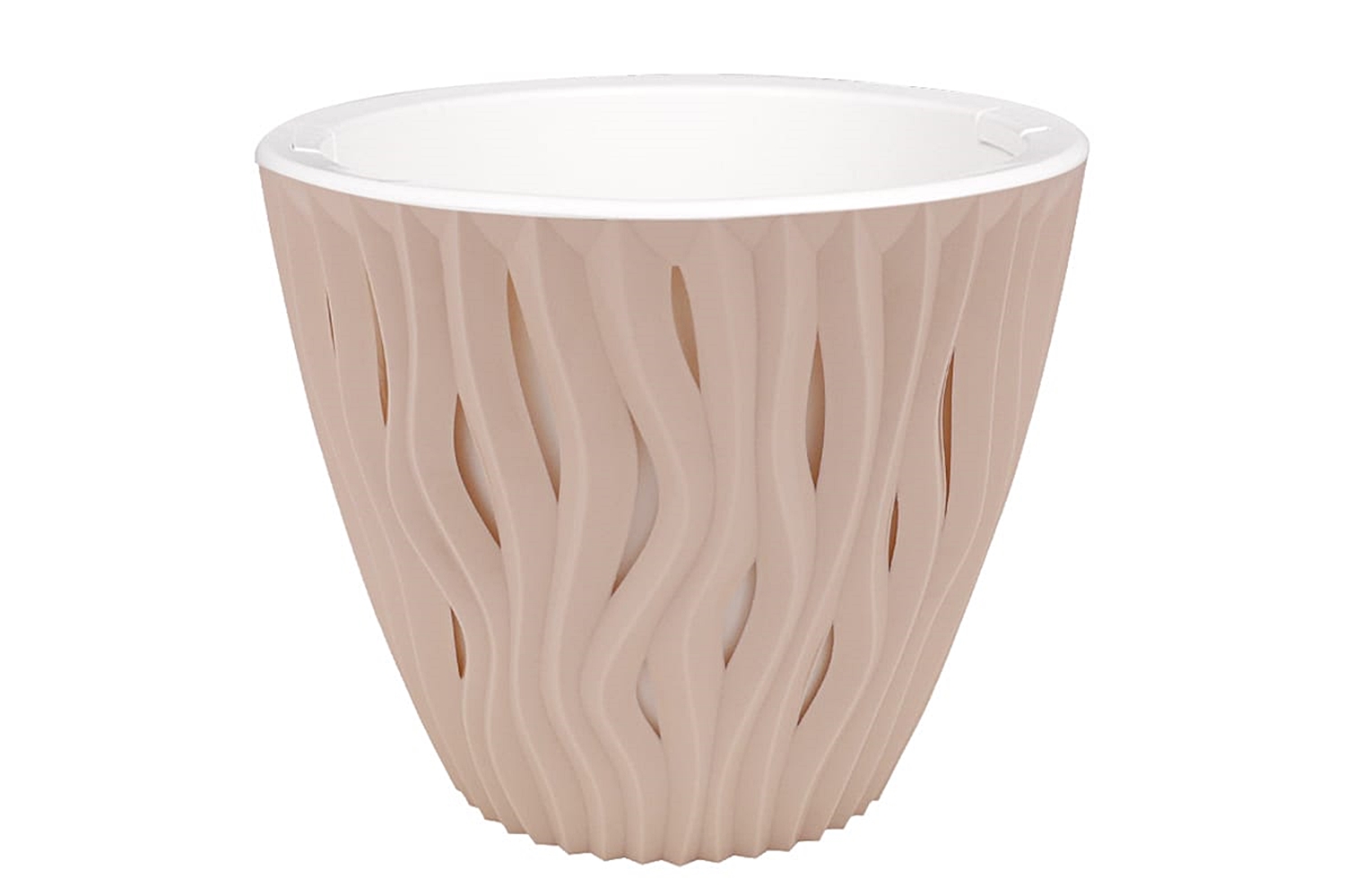 С объёмной волнообразной текстурой станут украшением любого интерьера - от сдержанного офисного до уютного домашнего. Кашпо представлены в самых разных объёмах, а потому подойдут для больших и маленьких растений, простых цветов и сложных флористических композиций. Конструкция предусматривает удобные технологичные ручки, которые упрощают уход за растением, а дренажная вставка обеспечивает отвод воды от грунта и позволяет дышать корневой системе. Похожие товары