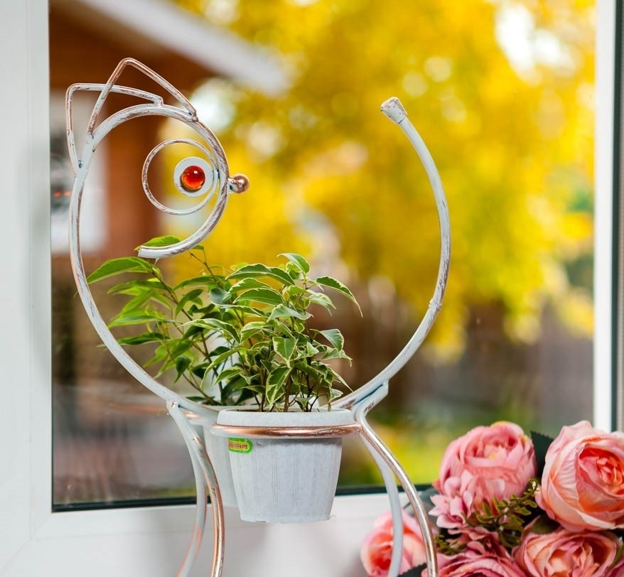 Подставка для цветов на окно из металла. Цветочница в виде кошки смотрится красиво и изящно, благодаря своим небольшим габаритам и утончённому оформлению. Предназначена для размещения двух цветочных горшков. Похожие товары