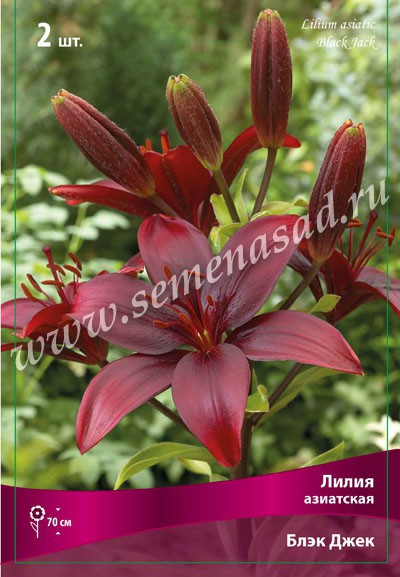 Лилии - многолетние травянистые, луковичные растения. Луковицы яйцевидной или округлой формы, 2-20см в диаметре, состоящие из отдельных сочных, незамкнутых чешуи, прилегающих друг к другу более или менее плотно. Стебли прямые, густо облиственные, зеленые, темно-пурпуровые или с темно-коричневыми штрихами, высотой 30-250см. У отдельных видов на стеблях, в пазухах листьев развиваются воздушные луковички — бульбочки, которые используют для размножения. Листья сидячие или черешковые, от 2-3 до 20см длиной, расположены в очередном порядке, реже мутовчато. Цветки одиночные или собраны по 2-4 в пирамидальные или зонтиковидные соцветия. Окраска белая, красная, оранжевая, розовая, сиреневая или желтая, большей частью с крапинками, полосками или пятнышками на внутренней стороне листочков околоцветника. Месторасположение: предпочитают солнечные, теплые, слегка затененные места. Почва: любая хорошо дренированная почва, богатая питательными веществами, рыхлая, песчано-глинистая, известкованная. Посадка: в сентябре, на глубину 15-20см. Размножение: клубнелуковицами и семенами. Использование: в групповых посадках, миксбордерах, клумбах, на срезку. Азиатские гибриды – самый многочисленный раздел, объединяющий более 2000 сортов, перспективных для выращивания повсеместно. Они довольно неприхотливы, отличаются морозостойкостью, быстро и легко размножаются. Цветки разнообразны по форме и окраске. Цветут во второй половине июня-июле. Пригодны для выгонки во внесезонное время. Блэк Джек - высота растения 70см, цветок темно-красный, однотонный. Похожие товары