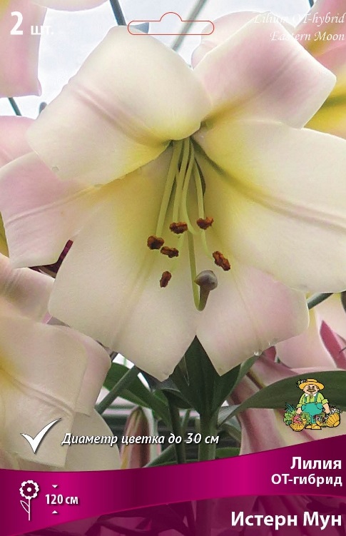 Истерн Мун - высота растения 120 см. Цветок ОЧЕНЬ КРУПНЫЙ, нежный, бело-сиренево-розовый с желто-зелеными лучами до середины лепестков и темными пыльниками, диаметр цветка до 30 см. Месторасположение: Предпочитают солнечные или слегка затенённые места. Почва: любая хорошо дренированная почва, богатая питательными веществами, рыхлая, песчано-глинистая, известкованная. Посадка: Срок осенней посадки - август-сентябрь, весенней – конец апреля-май. Глубина посадки – 10-15 см. На одном месте могут расти от 3 до 5 лет. Уход за растениями заключается в поддержании почвы во влажном, рыхлом состоянии, проведении подкормок. Хорошо замульчировать посадки. Большинство видов лилий не требует выкопки на зиму. Использование: в групповых посадках, миксбордерах, клумбах, на срезку. Похожие товары
