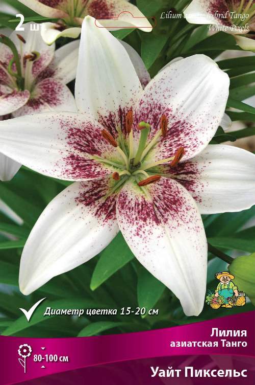Лилии - многолетние луковичные растения. Месторасположение: Предпочитают солнечные или слегка затенённые места. Почва: любая хорошо дренированная почва, богатая питательными веществами, рыхлая, песчано-глинистая, известкованная. Посадка: Срок осенней посадки - август-сентябрь, весенней - конец апреля-май. Глубина посадки - 10-15 см. На одном месте могут расти от 3 до 5 лет. Уход за растениями заключается в поддержании почвы во влажном, рыхлом состоянии, проведении подкормок. Хорошо замульчировать посадки. Большинство видов лилий не требует выкопки на зиму. Использование: в групповых посадках, миксбордерах, клумбах, на срезку. Азиатские гибриды группы Танго отличаются сильно выраженным обильным крапом на лепестках; иногда этот крап может сливаться в сплошное контрастное пятно в центре цветка. Они довольно неприхотливы, отличаются морозостойкостью, быстро и легко размножаются. Цветут во второй половине июня-июле. Пригодны для выгонки во внесезонное время. Уайт Пиксельc - КРУПНЫЙ, белый с густым вишневым крапом до середины лепестков, диаметр цветка 20 см. Похожие товары