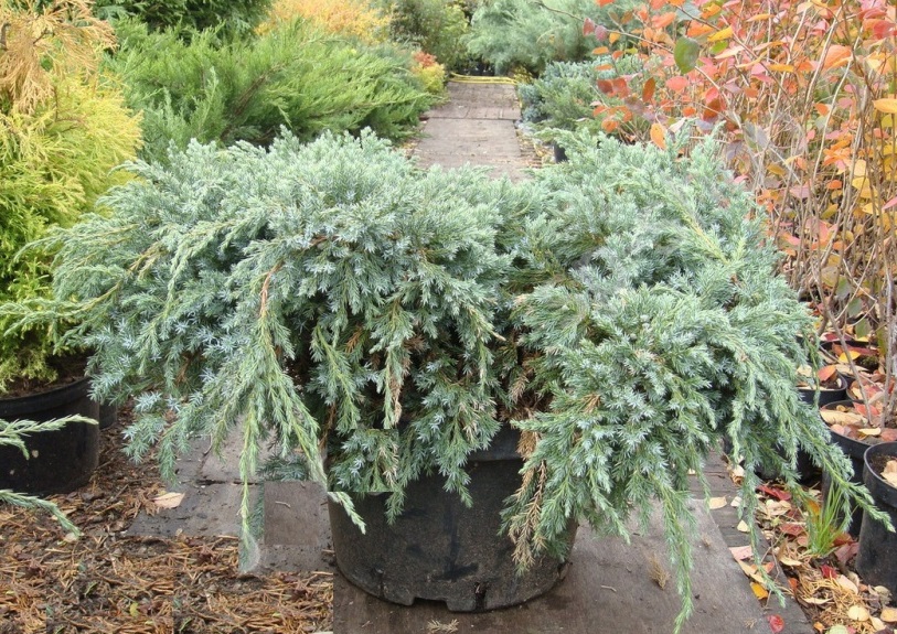 Форма: вечнозелёный карликовый, плоско – распростёртый кустарник с длинными, часто – расположенными, образующими неправильную подушковидную форму ветвями и слегка наклонёнными вниз концами побегов, медленнорастущий. Размер: 0,3 – 0,5 м высотой и 1,5 – 2,5 м шириной; годовой прирост в высоту 3 см, в ширину 10 (20) см. Хвоя: игольчатая часто - расположенная, 6 – 10 см длиной и 1,5 мм шириной, интенсивно голубовато - стальная. Свет: солнечное место. Почва: нетребователен, растёт на всех сухих и свежих, хорошо дренированных, а так же бедных почвах, от кислых до щелочных. Особенности: морозостойкий. Использование: очень декоративны в виде одиночных посадок и небольших групп в парковом ландшафте и среди камней. Особенно нарядно выглядят на фоне неглубокого снега. Похожие товары