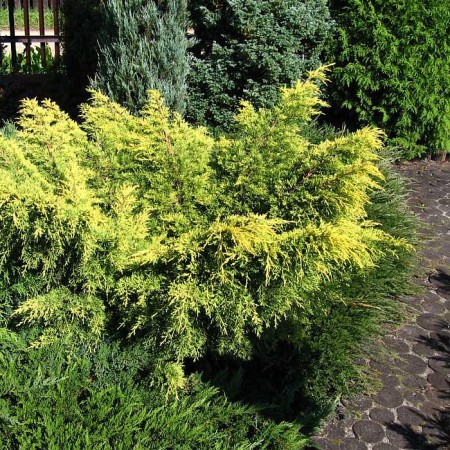 Можжевельник средний или пфитцериана Кинг оф Спринг (Juniperus x media King of Spring / Juniperus x pfitzeriana King of Spring) - широко распростертый хвойный кустарник высотой до 0,5м и диаметром 1,5м. Ветви сильно ветвятся. Хвоя мелкая, мягкая, плотная, желто-зеленая, на концах - ярко желтая. Молодой прирост золотистого цвета контрастирует со старой хвоей на протяжении нескольких месяцев. В тени теряет ярую окраску, поэтому рекомендуется высаживать на солнечных местах. К почвам неприхотлив, однако предпочитает рыхлые, слабокислые, суглинистые или супесчаные почвы. Устойчив к городским условиям. Используется в групповых и одиночных посадках, для создания ландшафтных композиций. Похожие товары