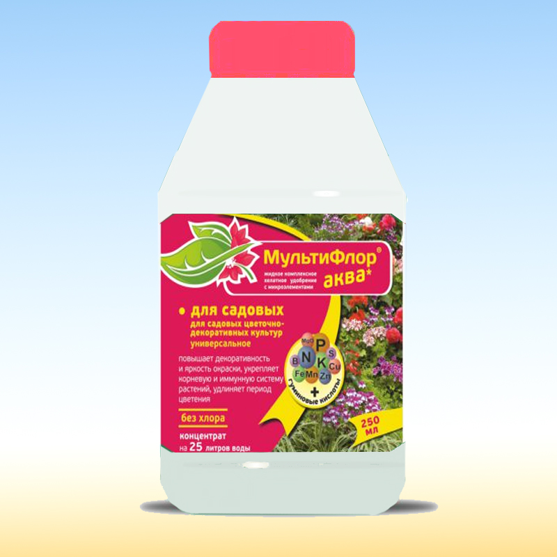 Жидкое комплесное хелатное минеральное удобрение с микроэлементами и гуминовыми кислотами для подкормки садовых цветочно-декоративных культур. Объем 250 мл Удобрение для садовых цветочно-декоративных культур применяется на протяжении всего вегетационного периода растений для корневой или листовой подкормки. В ранние фазы развития растения наиболее эффективным будет сочетание поливов и опрыскиваний растений подкормочным раствором. Удобрение повышает декоративность и яркость окраски, укрепляет корневую и иммунную систему растений, удлинняет период цветения. Улучшает свойства почвы. Массовая доля питательных веществ, %: N- 6,0; Р-2,0; К-6,0; м/э (Кобальт, Бор, Медь, Марганец, Молибден, Цинк); Гуминовые кислоты - 0,7, янтарная кислота. Похожие товары