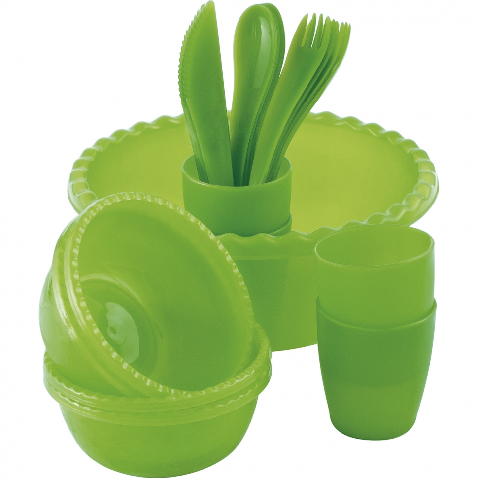 Полноценный набор для пикника, барбекю, загородной поездки или дачи. Пластиковая посуда: легкая, не бьется, многократного использования. Упакован в термоусадочную пленку. Комплектация: *Миска, объем 3 л. (1 шт.) *Миска, объем 0,4 л. (4 шт.) *Стакан, объем 0,4 л. (4 шт.) *Вилка (4 шт.) *Ложка (4 шт.) *Нож (4 шт.) Похожие товары