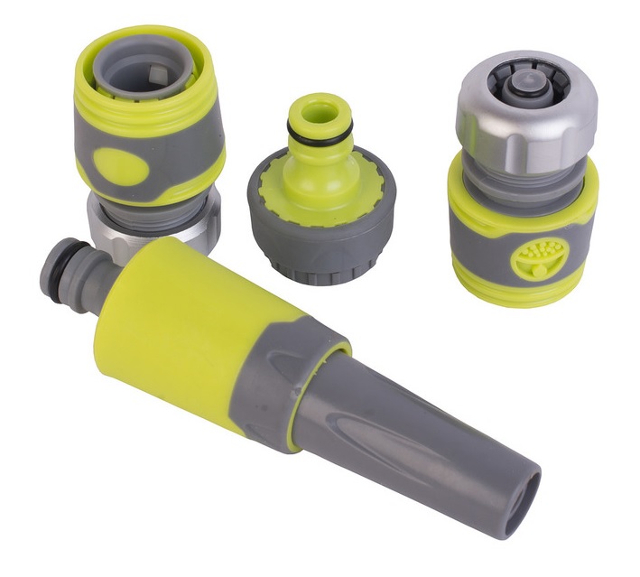 Применяется для полива различных типов растений. Плавная регулировка от жесткой струи до распыления. Снабжен комплектом соединителей. Материал:металл(сплав цинка),пластик. Комплектация: 1.Адаптер универсальный на 1/2" с внутренней резьбой и 3/4" с внутренней резьбой; 2.Коннектор; 3.Насадка; 4.Коннектор с автостопом. Похожие товары