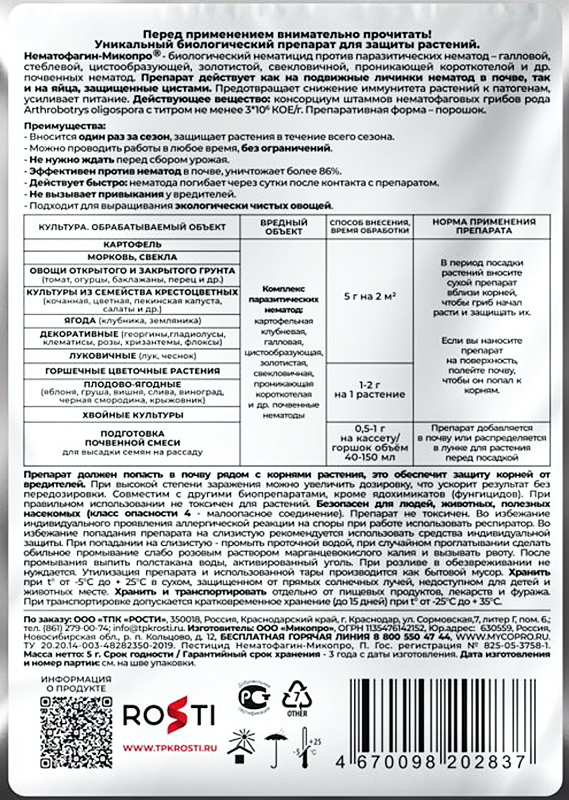 Органический биопрепарат-удобрение Нематофагин-Микопро® - биологический нематицид против паразитических нематод – галловой, стеблевой, цистообразующей, золотистой, свекловичной, проникающей короткотелой и др. почвенных нематод. Препарат действует как на подвижные личинки нематод в почве, так и на яйца, защищенные цистами. Предотвращает снижение иммунитета растений к патогенам, усиливает питание. Действующее вещество: консорциум штаммов нематофаговых грибов рода Arthrobotrys oligospora c титром не менее 3*106 КОЕ/г. Препаративная форма – порошок. Преимущества препарата: Вносится один раз за сезон, защищает растения в течение всего сезона. Можно проводить работы в любое время, без ограничений. Не нужно ждать перед сбором урожая. Эффективен против нематод в почве, уничтожает более 86%. Действует быстро: нематода погибает через сутки после контакта с препаратом. Не вызывает привыкания у вредителей. Подходит для выращивания экологически чистых овощей. Похожие товары