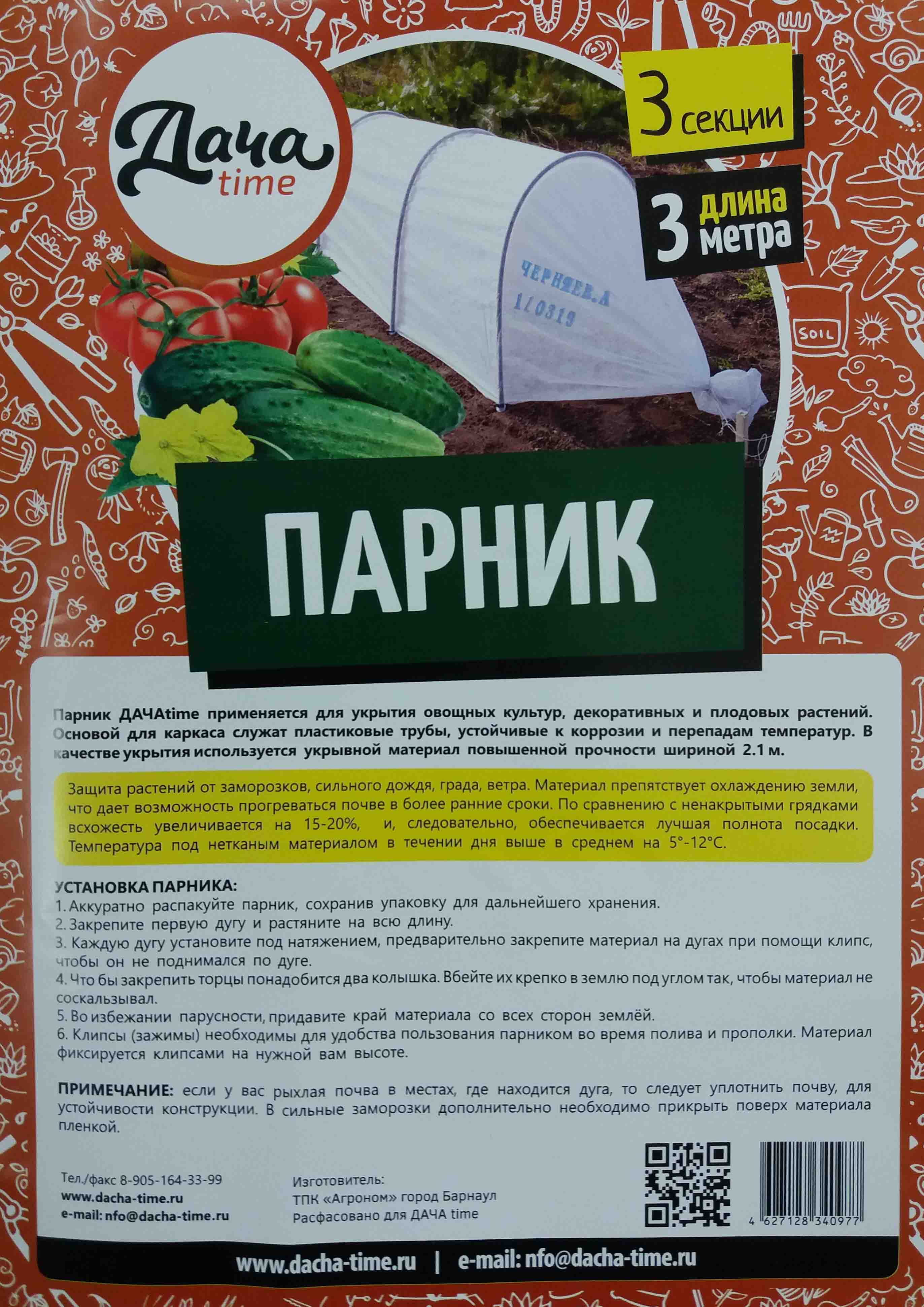 Парник ДАЧАtime применяется для укрытия овощных культур, декоративных и плодовых растений. Основой для каркаса служат пластиковые трубы, устойчивые к коррозии и перепадам температур. В качестве укрытия используется укрывной материал повышенной прочности шириной 2.1 м. Защита растений от заморозков, сильного дождя, града, ветра. Материал препятствует охлаждению земли, что дает возможность прогреваться почве в более ранние сроки. По сравнению с ненакрытыми грядкамивсхожесть увеличивается на 15-20%, и, следовательно, обеспечивается лучшая полнота посадки. Температура под нетканым материалом в течении дня выше в среднем на 5-12 *С. Комплект: клипсы,колышки длиной 25см,запас. колышек, дуга ПНД O 20 мм + укр.мат Reifenhauser REICOFIL 45 г/м2 Похожие товары