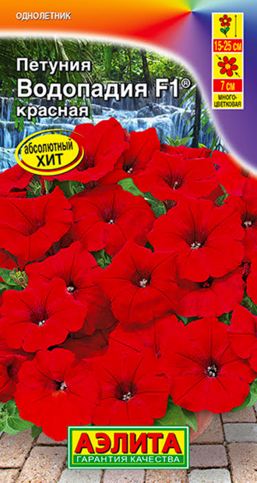 Петуния ВОДОПАДИЯ F1 красная - это сорт многоцветковых петуний каскадного типа, которая отличается совершенно новой полуампельной формой. Уникальность этих гибридов в том, что новые цветоносные побеги образуются без прищипки в пазухах листьев в середине куста, не оставляя пустот. Растения формируют пышные кустики, высотой 15-25 см. Поникающие побеги длиной до 70 см полностью усыпаны яркими насыщенными цветками O 7 см и спускаются восхитительным водопадом. Гибриды устойчивы к повышенным температурам и неблагоприятным погодным условиям. Петунии Водопадия F1® наилучшим образом подходят для подвесных кашпо и корзин. Похожие товары
