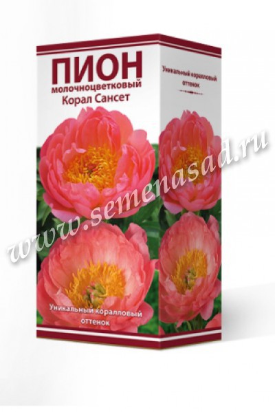 Пионы – травянистые многолетники с мощными мясистыми корнеклубнями, реже кустарники. Стебли до 100 см высотой. Цветки крупные одиночные, простые, полумахровые, махровые; белые, розовые, красные, реже желтые. Листья крупные рассеченные. Месторасположение: солнечный или полутенистый участок. Почва: умеренно сухая, свежая, богатая питательными веществами. Не переносит плотных почв. Посадка: весной или осенью, примерно за месяц до посадки готовят ямы 60х60х60 см. Делёнку сажают так, чтобы над почками был слой земли 3-5 см. При низкой или высокой посадке пионы не цветут! После пересадки сортовые качества проявляются на 2-3 год! Цветение: в первой половине лета. Использование: красивы в одиночных посадках, группами среди газона, в рабатках и смешанных посадках. Незаменимы в букетах и композициях. Корал Сансет - высота растения 90 см. Срок цветения ранний. Цветок крупный, полумахровый. При роспуске розово-коралловый, затем персиково-розовый, позднее - цвета топленого молока. Тычинки и нити желтые. Стебли крепкие, прямые. Ароматный. Срезочный сорт. Похожие товары