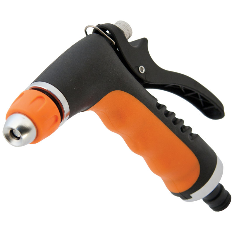 Пистолет регулируемый металлический для выполнения различных поливочных и очистительных работ. Пистолет распылитель металлический регулируемый отличается наличием возможности плавной регулировки воды. А именно ему под силу плавное изменение от жесткой струи до аэрозольного тумана. Разные растения требуется орошать струями разной формы и интенсивности. Возможности данного пистолета позволяют выбрать верное решение для любой ситуации. Возможность регулировки формы струи и расхода воды обеспечивает оптимальный уход за всеми зелеными насаждениями, исключая переувлажнение и необоснованные потери воды. Мы рекомендуем Вам остановить выбор на данном высококачественном металлическом пистолете, сочетающем изящество форм с долговечностью, превосходно лежащем в руке и способном доставить истинное удовольствие от работы в саду. Подключается к шлангу через коннектор. Подходит для шлангов любого диаметра. Полив от мощной точечной струи до мягкого тумана. Похожие товары