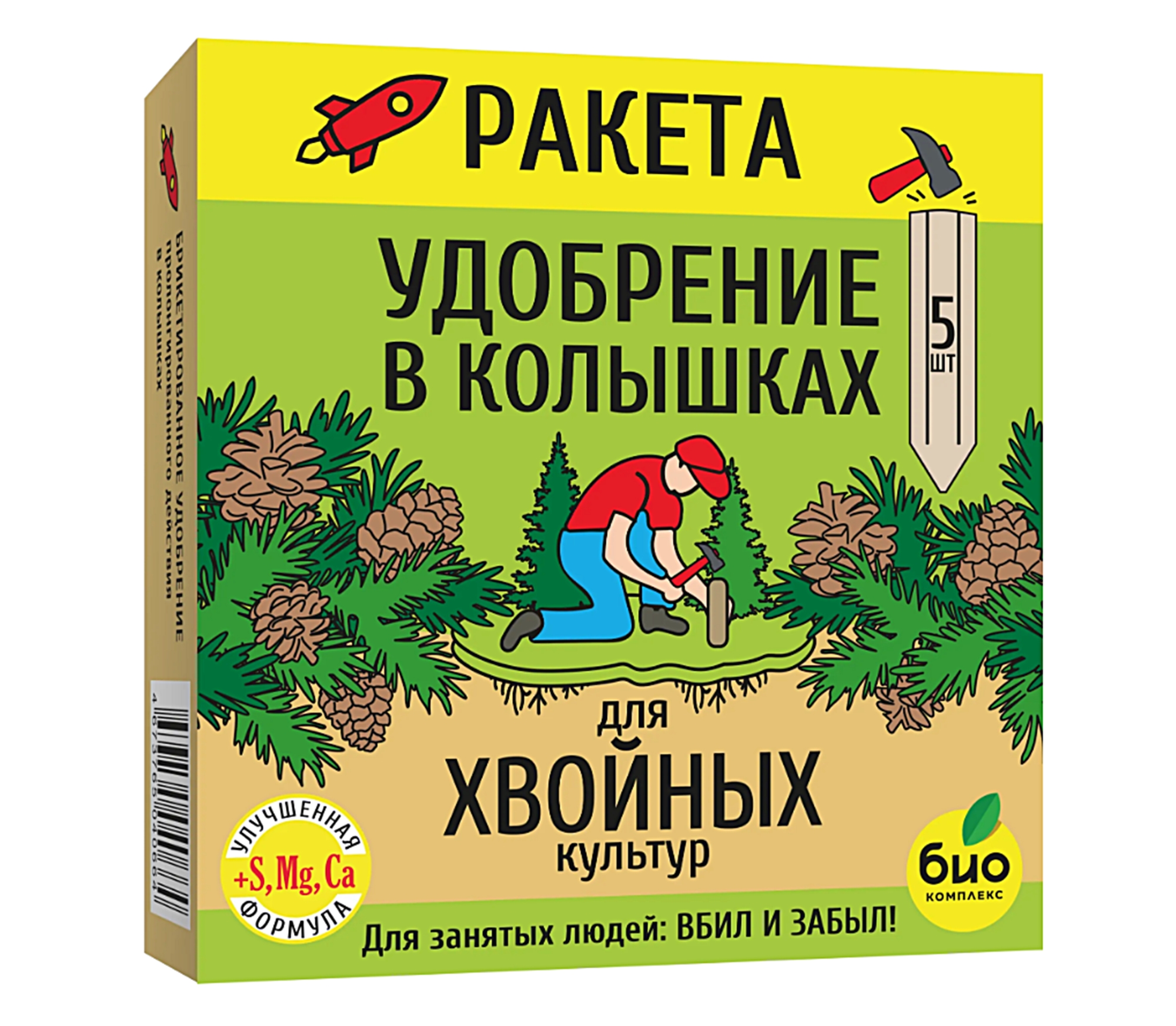 Удобрение в колышках "Ракета". Для Хвойных культур 420гр. (Ель, пихта, сосна, кедр, кипарис, туя). Применяется в качестве основного минерального удобрения для хвойных культур весной либо осенью. Растворение удобрений-колышек "Ракета" происходит постепенно в течение всего вегетативного сезона, в отличие от традиционных удобрений, которые сразу растворяются и вымываются из почвы.Не требует подготовки почвы (перекопки, взрыхления). Удобно. Вбил и забыл! Описание: Твердые брикеты - колья, весом 85гр. Упаковка полиэтиленовый пакет, картонная коробка. В одной упаковке 5шт. колышков.Вес упаковки 420гр. Способ применения: Вбить необходимое количество колышек-удобрений в увлажненную землю на всю площадь приствольного круга, используя деревянный молоток, в соответствии с рекомендуемыми дозами (согласно таблице на упаковке). Колышки-удобрения "Ракета" не пересаливают почву. Содержат все основные и важные минеральные вещества для обеспечения здорового роста на протяжении одного года. Массовая доля питательных веществ: Общий азот, N 5,0; Общий фосфор в пересчете на Р2О5 7,0; Общий калий в пересчете на К2О 7,0; рН 5,0-7,0. В том числе микроэлементы: медь, цинк, марганец, бор. Брикетированное, минеральное удобрение пролонгированного действия. Похожие товары