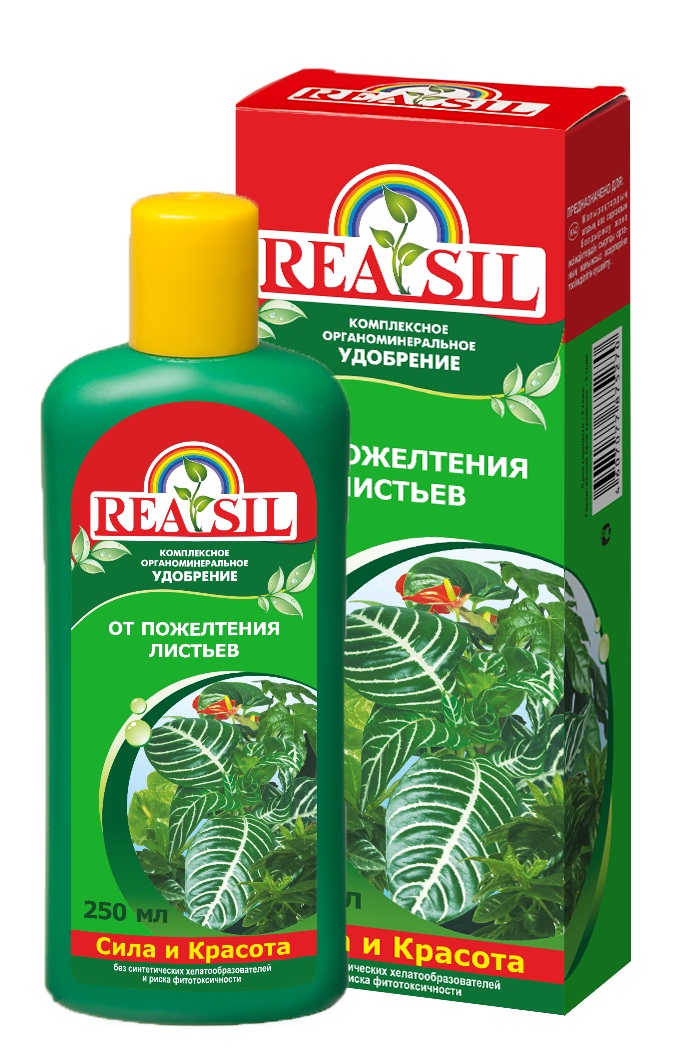 "REASIL" (РЕАСИЛ) ОТ ПОЖЕЛТЕНИЯ ЛИСТЬЕВ - высокоэффективное комплексное жидкое органоминеральное удобрение, отличается высокой степенью химической чистоты элементов, устойчивости хелатных соединений в широком диапазоне рН (от 4 до 11) и к солнечному свету - что является важным фактором в эффективности листовых подкормок. В качестве хелатирующего агента при производстве "REASIL" используется - гидроксиэтилидендифосфоновая кислота (ОЭДФ), которая по своей структуре наиболее близка к природным соединениям на основе полифосфатов и является регулятором роста растений. "REASIL" - новейший препарат, не имеющий аналогов по эффективности и широте применения. Действующие вещества, входящие в его состав воздействует на растение сразу по нескольким направлениям: - Комплекс органических кислот (лимонная, янтарная, L - лизин, гидроксиэтилиденди-фосфоновая) стимулирует и активизирует все обменные процессы в растении, мобилизирует иммунную систему, увеличивает проницаемость клеточной мембраны, ускоряет дыхание растения и повышает энергетику растительной клетки. - Комплекс витаминов группы В (В1, В3, В12) и аскорбиновая кислота (витамин С) ускоряет метаболические реакции в растении и стимулирует рост мощной корневой системы, способствует максимальному усваиванию корнями растений всех необходимых элементов питания из почвы. Так же, за счет витаминов группы В, происходит стимулирование развития ризосферных микроорганизмов, которые усиливают ферментативную активность почвы, превращают питательные вещества почвы в усвояемую для растений форму и повышают фиксацию атмосферного азота. - Комплекс макро - и микроэлементов (N, P, K, S, Mg, Fe, Cu, Mn, B, Zn, Mo, Co) - восстанавливает первоначальную зелень и свежесть желтеющих листьев, предупреждает несвоевременное пожелтение листьев комнатных растений и повышает иммунитет и устойчивость растений к неблагоприятным факторам внешней среды. Препарат применяется в виде рабочего раствора, который готовится путем разбавления исходного концентрата. Похожие товары
