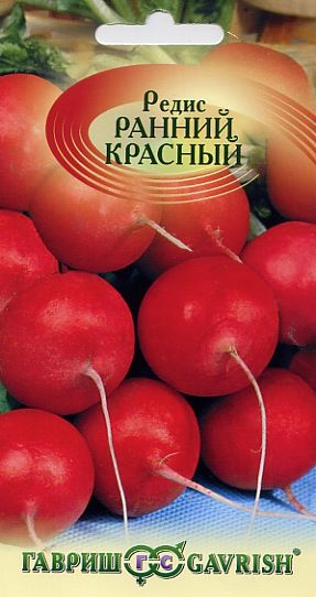 Редис «Ранний красный» — скороспелый (24-31 день) слабооблиственный высокопродуктивный сорт. Корнеплод округлой формы, диаметром 2,5-5,0 см, с гладкой поверхностью темно-красного цвета, массой 10-15 граммов. Мякоть белая, сочная, нежная, сладкая, слабо-острого вкуса, долго не дрябнет. Отличается от других сортов поздним стеблеванием, хорошо формирует корнеплод на почвах различного плодородия, в условиях повышенных температур и длинного дня. Урожайность 1,3-1,5 кг/м?. Похожие товары