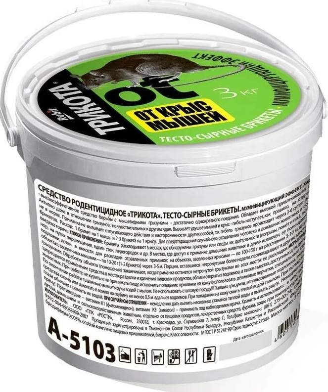 Мягкие тесто-сырные брикеты для уничтожения крыс и мышей в личных подсобных хозяйствах. Новый эффективный родентицидный препарат с мумифицирующим эффектом. Высокая привлекательность средства достигнута благодаря комплексу натуральных компонентов, лакомых для крыс и мышей. В состав приманки входит действующее вещество последнего поколения, что гарантирует уничтожения грызунов-вредителей даже при однократном ее поедании. Похожие товары