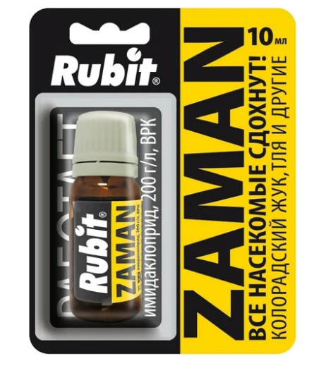 Инсектицидное средство от колорадского жука Rubit Заман 10 мл 67104 - это высокоэффективный препарат для уничтожения колорадского жука и его личинок, а так же картофельной коровки и тли. Обладает повышенной устойчивостью к смыванию дождем и действию высоких температур. Способ применения: 15 капель соответствуют 1 мл препарата. Для приготовления рабочего раствора растворить препарат сначала в небольшом количестве воды, при непрерывном помешивании. Затем чистой водой довести объем рабочего раствора до нужного количества из расчёта на 100 м2 и произвести обработку растений. После обработки обязательно промыть и высушить опрыскиватель. Рабочий раствор хранению не подлежит! Температурный режим от -10 до +30 °С Условия хранения хранить отдельно от пищевых продуктов, в недоступном для детей месте Состав - имидаклоприд Похожие товары