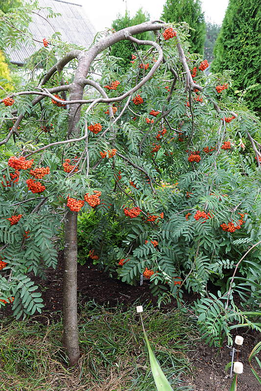 Это обыкновенная рябина, но с ниспадающими ветвями. В природе рябины имеют кудрявую крону - ветви приподнимаются. Прививка на высоте 2м даёт возможность получить у дерева кардинально другую форму кроны - с ниспадающими плакучими ветвями. Результат весьма привлекательный - дерево не вырастает большим как в природе, не выше 2-3м и ниспадающие ветви с красиво разрезанной листвой очень украшают сад. По всем остальным качествам плакучая рябина обыкновенная, т.е. цветёт кремовыми крупными шапками, потом к осени даёт оранжево-красные плоды. Рябина обыкновенная с прививкой очень пластична. По своему желанию Вы можете отгибать ветви в нужном направлении, подстригать, стричь вершину и прочее. Главное - это не подстригать слишком много сразу, дерево может ослабнуть.Зимуют без укрытия. Похожие товары