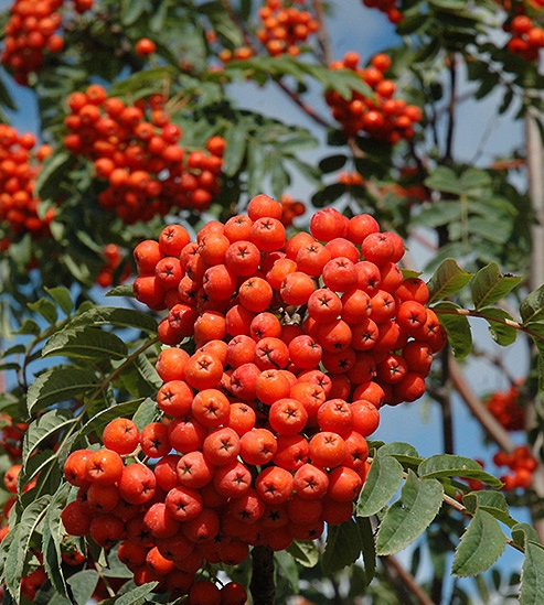 Дерево высотой 8-10 метров, с овальной или яйцевидной, плотной кроной, с направленными вверх, крепкими ветвями, диаметром до 4 м. В молодом возрасте крона яйцевидная, позже становится округлой. Листья темно-зеленые, непарноперистые, состоят из 9-15 листочков. Черешки листочков и листьев красные, более или менее войлочно-опушенные. Края листочков зубчатые, у основания цельно- крайние. Кончики листочков притупленные. Осенняя окраска варьирует от желтой до оранжево-красной. Плоды округлые, крупные, около 1,5 см в диаметре, темно-красные, съедобные, кислые, практически без горечи. Растет быстро. Похожие товары