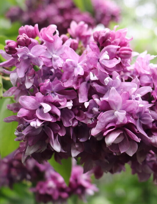 Бутоны темно-лиловые. Цветки крупные, до 3 см, махровые, с закрытым центром и расставленными венчиками. Лепестки удлиненные, с волнистым краем, темно-лиловые, со светлыми кончиками. Нижняя сторона перламутровая. К концу цветения приобретают розовый оттенок, а центр венчика становится голубым. Соцветие 21-27 см длиной, состоит из 2-4 плотных конических метелок. Куст среднего размера. Срок цветения ранний. Сирень отлично выглядит как в одиночных, так и в групповых посадках. Часто сирень используют как живую изгородь или высаживают рядом с беседками, чтобы создать тень. Подходит для городского озеленения. Похожие товары