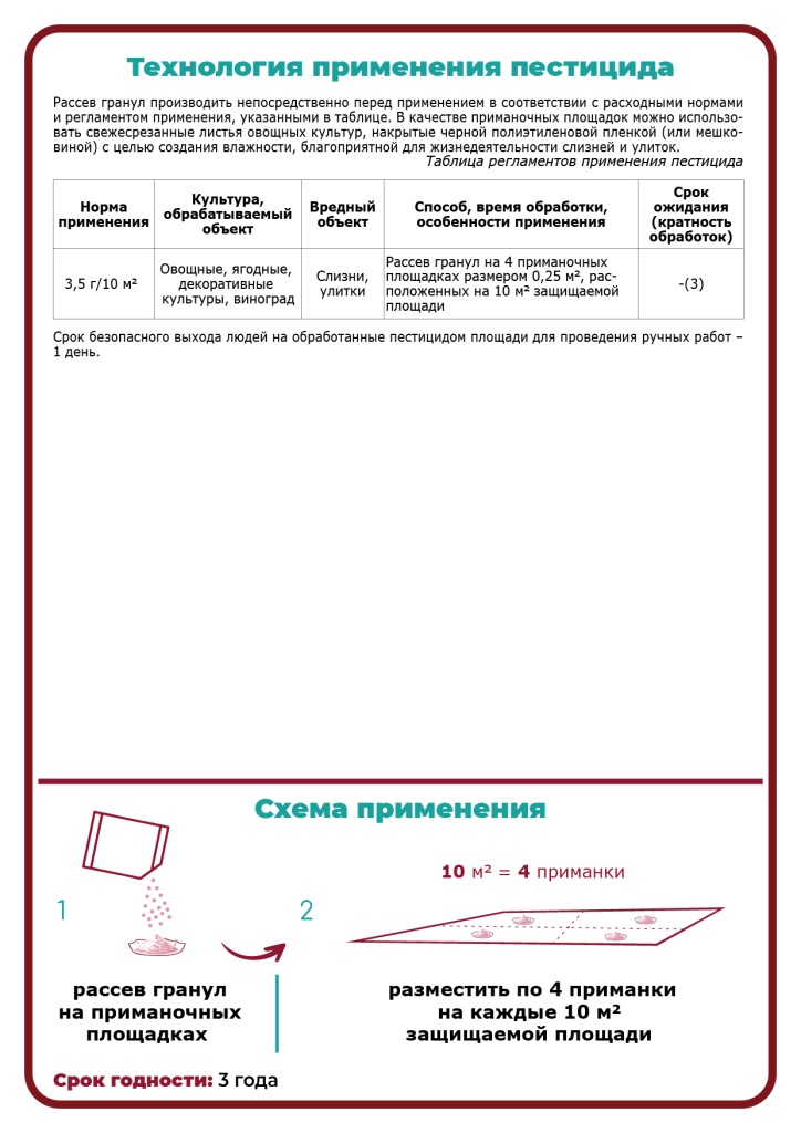 Действующее вещество: 60 г/кг метальдегида в гранулах Преимущества: -Контактно-кишечный моллюскоцид с быстрым действием; -Достаточно одной обработки, не требующей повторного рассыпания гранул; -Подходит для использования на приманочных станциях; -Безопасен для культуры, животных и полезных насекомых; Рекомендации по применению: Равномерно рассыпать гранулы вокруг растений, создавая своеобразный защитный барьер от слизней и улиток. Можно использовать гранулы на приманочных площадках, в качестве площадки используют свежесрезанные листья культуры, например, капусты, накрытые тёмной п/э пленкой для создания внутри влажных условий, и имитируя для вредителей естественные укрытия. Действие: Соприкосновение с гранулами ведет к поражению кожи и слизистых оболочек вредителей. Но основное губительное действие препарата — это контактно-кишечное отравление улиток и слизней. Результаты работы средства заметны через 3-5 дней. Период химической активности гранул длительный, не требующий повторного рассева гранул препарата. Полезно знать: Слизнегон не токсичен для растений, безопасен для дождевых червей и полезных насекомых. Но для человека и домашних животных метальдегид опасен, если его проглотить. Поэтому гранулы специально окрашивают в яркий голубой цвет, чтобы не привлекать птиц и животных. К тому же в составе есть добавки, которые отпугивают домашних животных. О компании: АО «Щелково Агрохим» - один из мировых лидеров профессионального рынка средств защиты растений и удобрений для крупных аграрных комплексов. И уже более 10 лет компания поставляет свою продукцию на рынок для простых дачников и садоводов. «Щелково Агрохим» заботится о том, чтобы каждый смог позволить себе использовать качественные современные препараты на своих садовых участках. Похожие товары