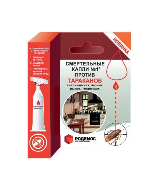 Смертельные капли против всех тараканов предназначены для быстрого уничтожения всех видов тараканов: черных, рыжих, американских, гигантских и других Инструкция по применению: Средство наносится на подложку и раскладывается в местах концентрации и передвижения тараканов. При малой и средней численности тараканов гель наносится на подложку из расчета 1 капля на 1 погонный метр; при высокой численности тараканов - 2 капли на 1 погонный метр. Затем подложки с гелем расставляются в местах обнаружения, возможного обитания и передвижения тараканов: под раковиной, за холодильником, около щелей, вёдер, столов, около стояков и труб горячего водоснабжения и др. При очень высокой численности тараканов в помещениях количество капель геля на подложку следует увеличить в 2-3 раза. Похожие товары