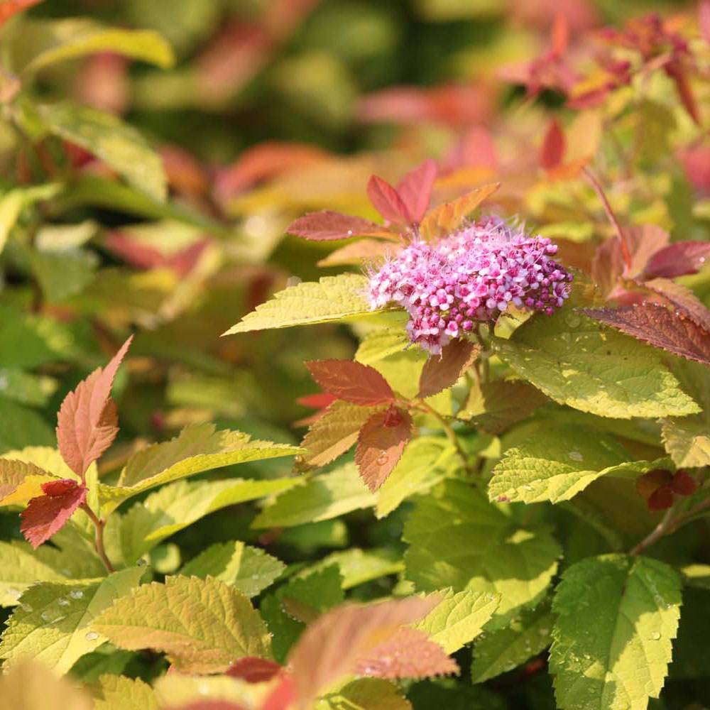 Очень эффектный сорт с золотистой лисвой, покрытой пятнами розового оттенка, и ярко-розовыми цветками имеет куст высотой и шириной 1,2 м, с компактной, плотной, полушаровидной кроной. С ранней весны листья золотисто-желтые, молодые на концах побегов розовато-красноватые, но к концу лета этот цветовой эффект исчезает и листья становятся светло-зелеными и лишь по периферии куста сохраняются красноватые оттенки. И лишь осенью возвращается яркий окрас листьев. Цветение с июля до конца августа обильное, цветки розовые, собраны в плоские щитки. Похожие товары