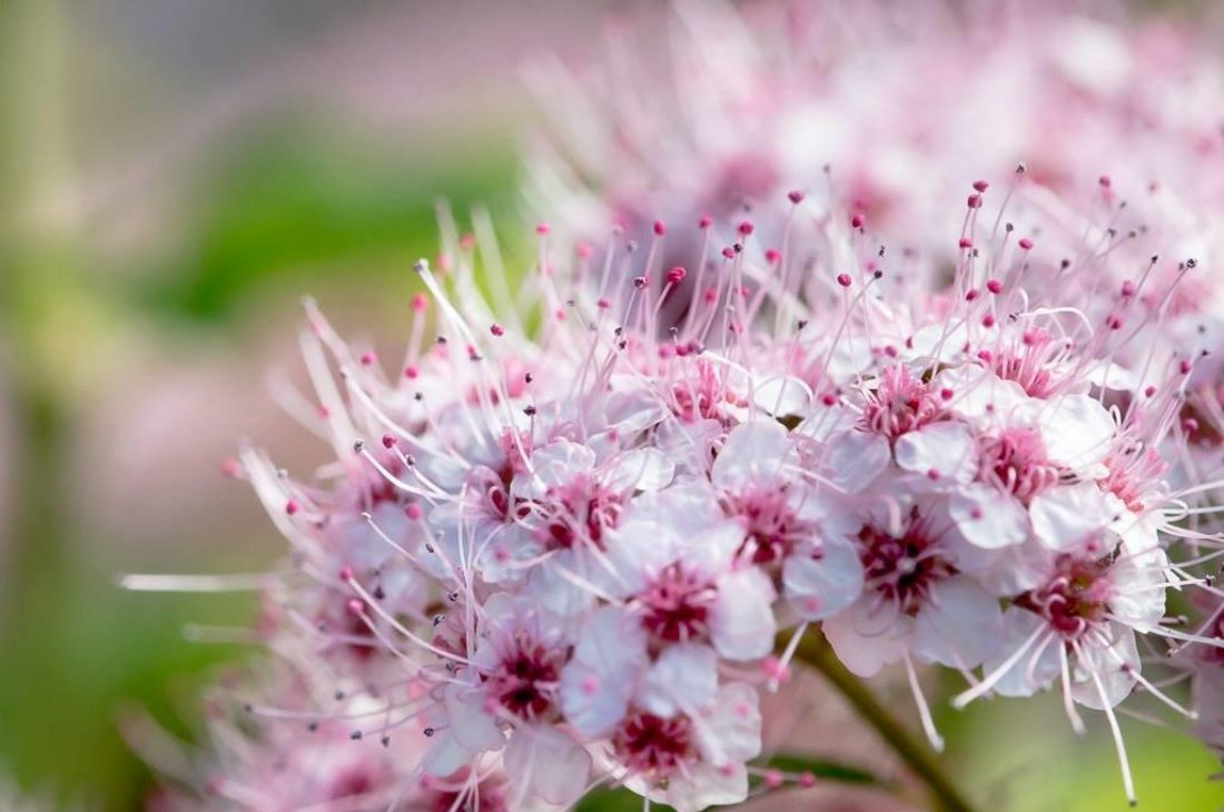 Высота этого многолетника варьируется от 0,8 до 1 м, при этом диаметр округлой и симметричной кроны достигает полутора метров. Растёт куст довольно быстро. Имеет мощные мочковатые корни. Куст отличает наличие прочных, прямостоячих побегов, цвет их красный. Листовые пластинки яйцевидные, имеют зазубренный край. В начале весны, после распускания листва окрашена в яркую красновато-розовую гамму, которая в середине лета меняется на светло-салатовый цвет, а по осени куст становится ярким, с красными и жёлтыми листками. Обильное цветение приходится на июль-август. Щитковидные соцветия имеют размер 3 см, цветки характеризуются колесовидной формой. Лепестки окрашены в белый, а пестик и тычинки - в тёмно-розовый. Первое цветение можно наблюдать на 3 или 4 год после посадки. Похожие товары