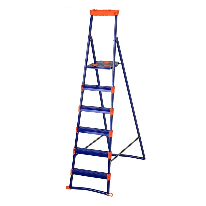 Стремянка металлическая 6 ступеней, высота до рабочей площадки 1285мм, ширина ступени 65мм, многофункциональный лоток для инструментов, страховочная лента, максимальная нагрузка 120кг, вес изделия-8,3кг. Похожие товары